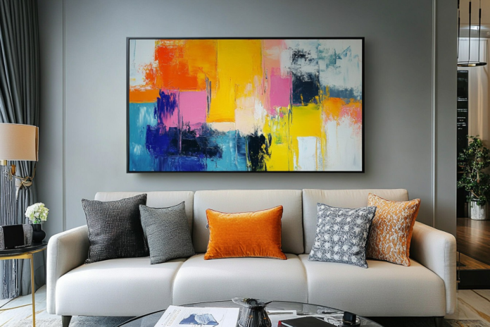 Another important consideration when choosing the size of an abstract painting for a living room is proportionality. A general rule of thumb is that artwork should take up about two-thirds to three-fourths of the width of the furniture it is positioned above, such as a sofa or console table. This guideline ensures that the painting does not appear too small or disproportionately large in relation to its surroundings. For instance, if your sofa is 84 inches wide, an abstract painting that is approximately 56 inches to 63 inches in width would create a well-balanced look.