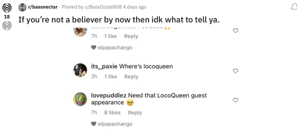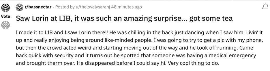 Lina had a similar in-person experience when she wore a shirt with a Bassnectar album cover to a bass music show in late 2021.